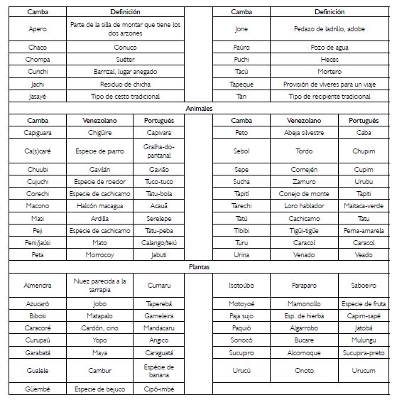 En este glosario se reproducen los términos regionales (del castellano camba) que ocurren en las glosas de este artículo y se proporcionan definiciones. Para los zoónimos y fitónimos, se dan sus equivalentes en portugués y en el castellano venezolano (dos otras variedades ampliamente conocidas por los estudiosos de la Amazonía).