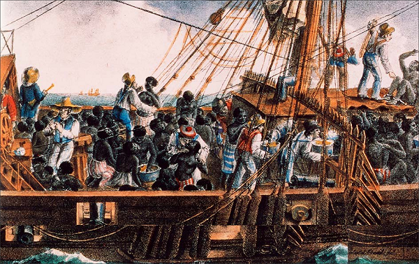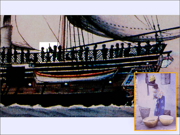 Esta imagem mostra mulheres africanas no convés do navio negreiro. Elas estão envolvidas nas tarefas de descasque ou ‘pilagem’ manual de grão, a qual até hoje em dia na África continua sendo um trabalho feito por mulheres. Não sabemos se as mulheres estão a pilar sorgo, milho ou arroz. Entretanto, nenhuma dessas culturas africanas existia nas Américas antes da chegada dos europeus e dos africanos. A área de destaque na imagem mostra claramente duas mulheres escravas a segurarem pilões e a descascarem grãos à maneira tradicional africana, num pilão de madeira. O que desperta o interesse acadêmico nesta imagem é a ilustração da necessidade de descascar o cereal manualmente num navio escravo. Isso indica que o capitão do navio comprou o grão em casca, o que, nesse estado, é impróprio para consumo. Esse detalhe é significativo porque, se não fosse descascado, todo o grão que restasse de uma viagem de escravos poderia potencialmente servir de sementeira para cultivo. Enquanto a maioria das viagens dos navios negreiros não terminava com excedentes de provisões, algumas ocasionalmente as tiveram. E quando isso acontecia, davam oportunidade às escravas para obter sementes e propágulos de culturas com que estavam familiarizadas.