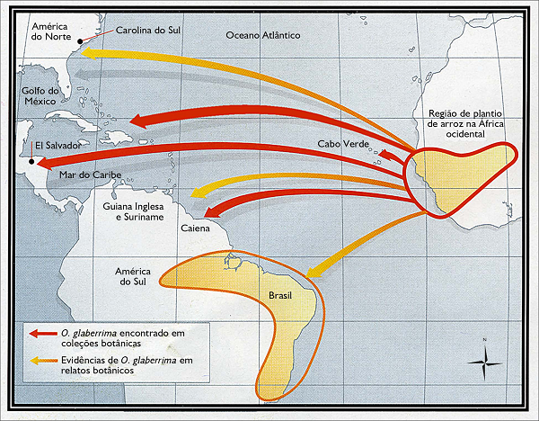 Como resultado, o mapa da difusão de arroz africano para o Novo Mundo no “Black rice” agora pode ser revisto. A Figura 4 apresenta esta revisão, indicando no mapa o local onde foi encontrado o arroz africano e onde ainda pode ser encontrado em coleções botânicas e por escavações arqueológicas.