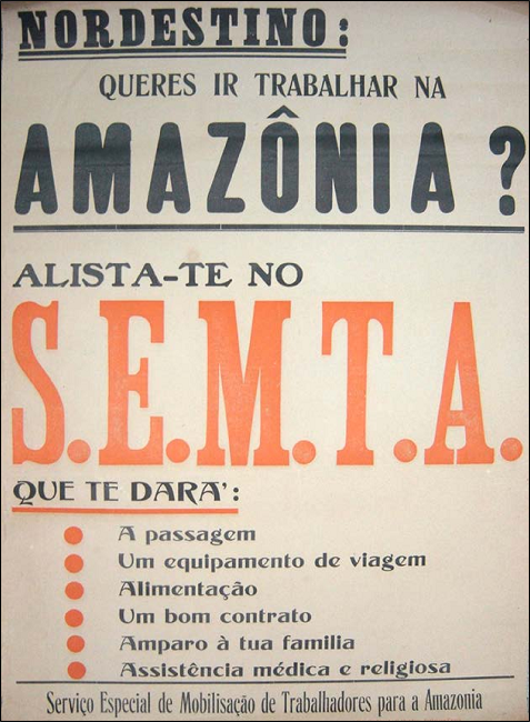 O fluxo migratório da população da região Nordeste para a Amazônia foi intenso entre meados do século XIX e início do século XX, quando muitos deixaram o sertão em busca de melhoria de vida ou fugindo das privações causadas pelas secas (Campos, 2006, p. 139). Ainda que menos dramática do que as grandes secas dos anos de 1897, 1915 e 1932, a estiagem do início da década de 1940 chegou a dezenas de milhares em Fortaleza (Martinello, 1988, p. 210; Morales, 2002, p. 136). Essa crise humanitária tornava-se uma espécie de ‘solução’ para a imensa demanda por borracha e uma “justificativa ‘moral’ do deslocamento de trabalhadores de um ponto a outro do território nacional” (Secreto, 2007a, p. 59). A crise fez com que o Estado brasileiro se apresentasse como “mediador entre necessidades e oportunidades” ao longo do processo de recrutamento para a produção da borracha (Secreto, 2007a, p. 83).