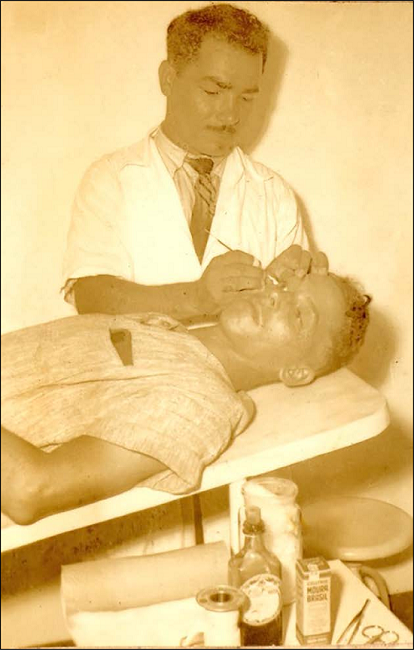 Na medida em que os médicos foram examinando milhares de homens, a lista de doenças e problemas que indicariam inaptidão temporária ou permanente foi crescendo (“Circular ao sr. médico de seleção”, 1943). Na lista inicial, por exemplo, o ‘tracoma incipiente’ não constava como uma doença do aparelho visual e problemática para a seleção (“Lista anexa”, 1943). Ao longo dos primeiros meses, os médicos foram compreendendo a gravidade dessa doença no universo dos recrutados. Essas inclusões atestam que esses médicos conheciam pouco os problemas de saúde das populações da região para além das grandes endemias rurais, como a malária, a ancilostomíase e a esquistossomose. A Figura 6 é integrante de uma série produzida pelo estúdio cearense ABA-Film10 e demonstra justamente essa etapa do exame médico, no caso oftalmológico.