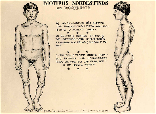 Como muito provavelmente os médicos do SEMTA não possuíam conhecimentos aprofundados de biotipologia, a aplicação dessas categorias era orientada tanto por um ‘manual de classificação’, quanto pelos cartazes ilustrativos dos ‘biótipos nordestinos’, retratados de frente e perfil, com descrições de suas características fundamentais, como o do disgenopata, a priori o mais indesejável (Figura 7). Jean-Pierre Chabloz, autor dos cartazes de propaganda do SEMTA, também elaboraria esse material.