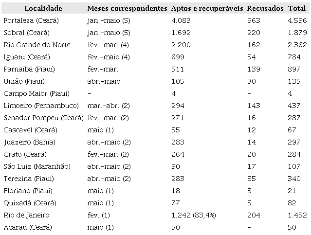 O mais rígido foi Alberto Tavares Torres, médico do posto de seleção de Limoeiro, em Pernambuco (Silva, 1943c). Seu relatório indica que recusara 48,4% dos candidatos examinados em março e abril de 1943. Não há indicações que expliquem esse percentual de recusa, mas talvez as condições de saúde encontradas fossem inegociáveis para este médico. No entanto, Torres foi uma exceção entre seus colegas. O maior contingente de trabalhadores enviados à Amazônia veio dos estados do Ceará e do Rio Grande do Norte, com altas taxas de aptidão, conforme a Tabela 1, relativa ao total de exames médicos nos primeiros meses de 1943. A maioria dos médicos do SEMTA utilizou critérios elásticos quando da identificação de doenças que poderiam inviabilizar a seleção de um número expressivo de trabalhadores. O olhar médico, pretensamente neutro porque científico, foi emoldurado pela lógica da demanda por borracha dentro do esforço de guerra (Miranda, 2013, p. 159).