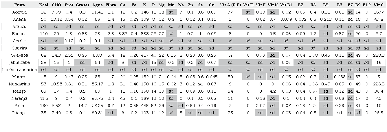 En base al calendario de fructificación y cosecha se trabajó en la revisión de las características nutricionales de las especies. Esta revisión se basó en la información provista por la base de datos de USDA (Food Data Central) (U. S. Department of Agriculture, n.d.). La información fue complementada con la colección de libros de La Biota Rioplatense, en especial los volúmenes de Hortalizas y Frutas (Hurrell et al., 2009, 2010). También se utilizaron como referencia el libro de “Plantas Alimentícias não Convencionais (PANC) no Brasil: Guia de identificação, aspectos nutricionais e receitas ilustradas” de Kinupp y Lorenzi (2014) y el Vademecum Alimentario virtual de la Comunidad de Expertos de Nutrición: Nutrinfo (n.d.). Por último, esta información se complementó con estudios actuales referentes a la composición nutricional de los frutales. Para ello se realizó una revisión bibliográfica en Google Scholar. Se utilizó como descriptores los nombres científicos de las especies y las palabras ‘aporte nutricional, composición química, información nutricional, ingesta recomendada’ en castellano, portugués e inglés. Con los datos obtenidos se generó una base de información para cada especie. En caso que hubiera discordancias en la información se tomó como criterio establecer el dato más actualizado como el correcto, ya que las informaciones más novedosas pueden relacionarse con nuevas técnicas de investigación nutricional.