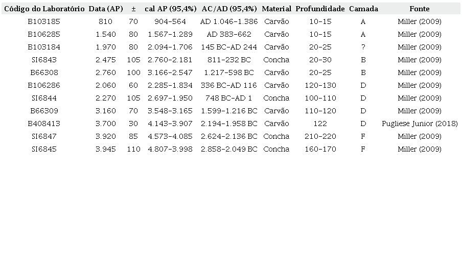 A cronoestratigrafia do sambaqui envolve três períodos de ocupação: 1) fase Cupim (ca. 6.000 a 5.800 anos cal AP); 2) fase Sinimbu (ca. 5.800 a 5.000 anos cal AP); 3) e fase Bacabal (ca. 4.300 a 700 anos cal AP) (Pugliese Junior, 2018)3. Estes pacotes arqueológicos estão compostos principalmente por camadas ocupacionais intercaladas com camadas construtivas, onde predominam as conchas de gastrópodes inteiras e fragmentadas a partir do final do Holoceno médio (Figura 1B).