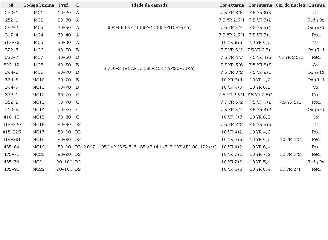 As 22 amostras de cerâmica analisadas pertencem a cinco camadas estratigráficas, distribuídas ao longo de 1,5 metros de profundidade, em um período que vai de c. 4.000 a 700 anos AP. As cerâmicas das camadas B e D2 apresentam menor proporção média de matriz argilosa (37% e 33%) do que as cerâmicas das camadas A, C e D3 (50%, 53% e 50%) (Figura 11). A menor proporção média de matriz argilosa é compensada por uma maior proporção média de inclusões de cauixi nas cerâmicas da camada B (47%) e uma maior proporção média de inclusões de quartzo nas cerâmicas da camada D2 (22%). As cerâmicas da camada A são as que apresentam a menor proporção média de inclusões de cauixi (33%). A proporção média de vazios não apresenta variações maiores do que 1% entre as distintas camadas arqueológicas. Assim, não existe padrão linear de incremento ou redução da proporção média dos distintos elementos constituintes da pasta cerâmica (matriz, inclusões e vazios) ao longo de camadas arqueológicas subsequentes (Figura 11).
