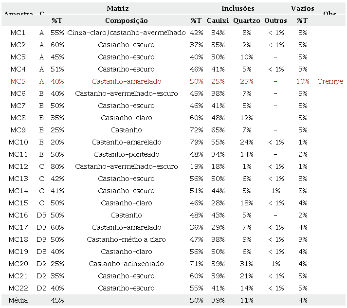 A proporção de ambos os constituintes majoritários, matriz argilosa e inclusões de cauixi, varia entre as amostras analisadas, sem diferença estatisticamente significativa entre as suas médias (teste-T para proporção ≥ p = 0,24). O mesmo é verdade quando se compara a proporção média de matriz argilosa com a proporção média do total de inclusões (i.e. cauixi + quartzo; teste-T para proporção ≥ p = 0,36).