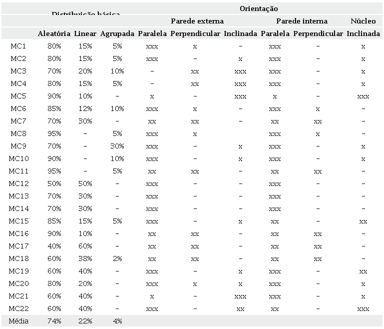 Em todas as 22 amostras analisadas, as inclusões de cauixi são visíveis não apenas ao microscópio, como também a olho nu. As inclusões de cauixi apresentam empacotamento fechado e distribuição aleatória (µ = 74%) e linear (µ = 22%) (Tabela 4). A distribuição linear, presente em 82% das amostras, é visível na seção longitudinal das espículas, cuja orientação é sempre paralela às paredes e de tipo bimodal (tanto paralela, quanto inclinada – com ângulo de até 60°) (Tabela 4; Figura 7). Esta avaliação indica que, quando o cauixi está orientado, a posição do eixo maior das espículas é sempre paralela às faces externa e interna dos fragmentos (Figura 7). Em 50% das amostras, o cauixi aparece na forma de pequenos feixes ou agrupamentos (µ = 4%) (Tabela 4; Figuras 5C e 5D).