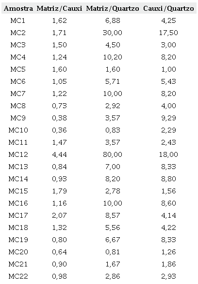 A proporção de matriz argilosa na pasta cerâmica é, em média, 9,54 vezes maior do que a proporção de inclusões de quartzo, com valores variando de -1,24 até 80,00 vezes (Tabela 5; Figura 9). Entretanto, as duas amostras com as razões mais elevadas entre matriz argilosa e inclusões de quartzo (MC12 = 0,80 e MC2 = 0,30) são outliers estatísticos, refletindo a quantidade quase nula de inclusões de quartzo e seu impacto exponencial no cálculo das razões. Quando os dois outliers são excluídos, o valor máximo e a média para a razão argila/quartzo caem para 10,20 e 4,99, respectivamente. Apesar do predomínio geral da matriz argilosa em relação às inclusões de quartzo, existem duas amostras (MC10 e MC20) onde há predomínio do quartzo em relação à matriz argilosa (Tabela 3).