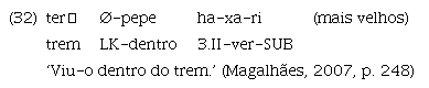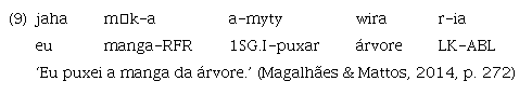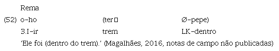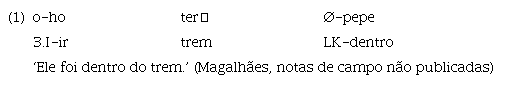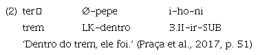 O exemplo (1) mostra o verbo ho ‘ir’, associado à marca de terceira pessoa da série I, exclusiva de verbos ativos, que expressa o argumento único deste verbo, seguido pela expressão adverbial formada pelo sintagma posposicional terẽ ø-pepe ‘dentro do trem’. Em (2), quando a posição é invertida e o mesmo verbo passa a ser precedido pela expressão adverbial, ele adquire um sufixo -ni(~ -ri) e passa a expressar seu argumento por meio da série II, uma série de marcadores pessoais tipicamente associada a argumentos expressos em orações subordinadas ou em itens lexicais nominalizados. Isso justifica, por ora, a escolha de glosar o referido sufixo como SUB ‘subordinador’. Tal denominação será melhor discutida na seção ‘Expressão de pessoa nas distintas classes de palavras’.