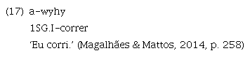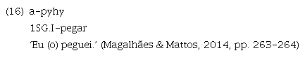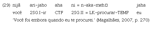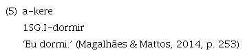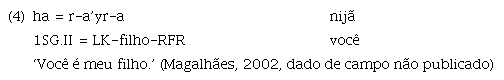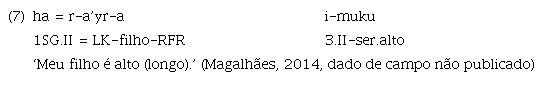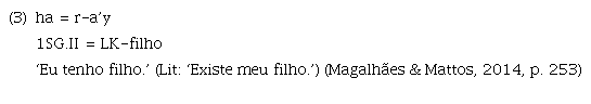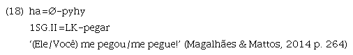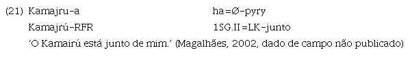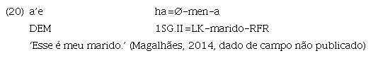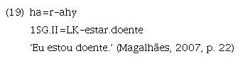 O paradigma de marcadores da série I é formado por prefixos pessoais que ocorrem exclusivamente com verbos – exemplos (16) e (17) –, expressando seu argumento com função semântica de agente. Já o paradigma da série II é formado por clíticos pronominais, ligados ao núcleo do predicado por meio de um linker (LK) prefixal cuja função sincrônica restringe-se a marcar a adjacência entre o núcleo de um predicado e seu dependente. Esta série expressa o argumento com papel semântico de paciente em predicados verbais – exemplos (18) e (19) –, o possuidor de nomes possuíveis – exemplo (20) – e o objeto de posposições – exemplo (21) –, sendo, portanto, um paradigma de marcas pessoais transcategorial. Há, ainda, conforme Magalhães e Mattos (2014), uma cisão da intransitividade formalmente expressa pelo uso exclusivo da série I em verbos intransitivos (monovalentes) eventivos e uso exclusivo da série II em verbos intransitivos (monovalentes) estativos. No caso da série I, a marca de terceira pessoa é prefixal, diferindo das demais, que são clíticas, conforme se pode observar na Tabela 1.