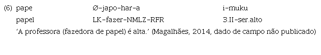 O fato de, em Guajá, esse fenômeno ocorrer não só com verbos, mas também com nomes, como em (39), nos leva a considerar mais adequado denominar esse sufixo de subordinador, e não de nominalizador19. Como explicado, interpretamos que, toda vez que o sufixo ni ~ ri ocorre, ele está associado a um predicado que está subordinado a outro, uma vez que eles precisam estar hierarquicamente organizados na sentença.