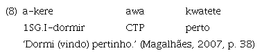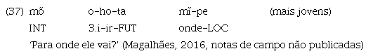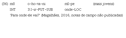 Como analisar, de acordo com o que foi até agora apresentado acerca dessa construção, os exemplos (38) a (41), em que não é uma expressão adverbial que ativa a alteração morfológica no núcleo do predicado, mas três diferentes partículas: kwa, uma partícula mostrativa (Magalhães, 2007, p. 75) que ocorre em orações que indicam a localização pontual, mõ, uma partícula interrogativa que introduz perguntas de informação (Magalhães, 2007, p. 78), e ame͂,, uma partícula que introduz pedidos de permissão (Magalhães, 2007, p. 79)?