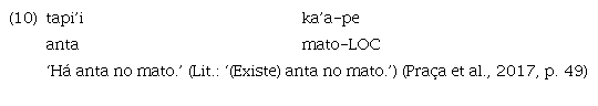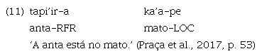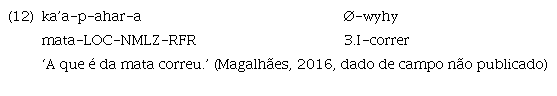 O exemplo (11) ilustra uma expressão adverbial como núcleo de um predicado adverbial locativo independente, que tem como argumento o nome tapi’ira ‘anta’. Em (12), a expressão adverbial ocorre nominalizada, sendo o verbo wyhy ‘correr’ o núcleo do predicado.