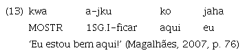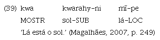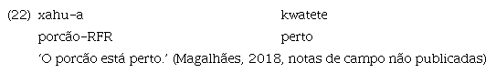 No caso da anteposição da partícula mostrativa – exemplo (39) –, uma possível justificativa para a alteração morfológica do nome que ocorre como predicado é propor a hipótese de que esta partícula tenha origem locativa, uma vez que observamos, por exemplo, a existência de advérbios locativos com a mesma raiz no Guajá, como kwatete ‘perto’ e kwa’ate ‘no alto e próximo’, que poderiam atestar a origem adverbial da partícula.