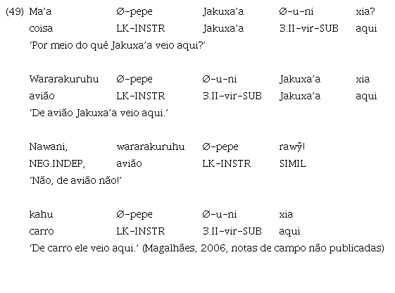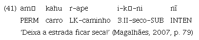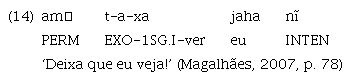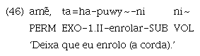 O Guajá apresenta evidência adicional para esse questionamento, uma vez que o verbo ocorre associado ao sufixo -ni ~ -ri também quando expresso no modo exortativo, marcado pelo prefixo t- ~ ta= ~ ti=, conforme exemplo (46)17. O dado prova que não seria possível interpretarmos o chamado “modo indicativo II” (Rodrigues, 1953, p. 126), ou “modo circunstancial” (Seki, 2000, p. 131), como modo, pois a mesma raiz verbal não poderia expressar ao mesmo tempo dois distintos modos.