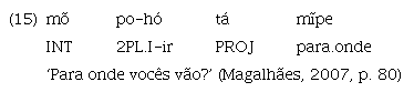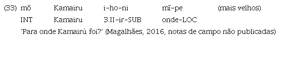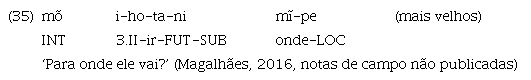 A partícula interrogativa mõ “. . . introduz perguntas de informação e ocorre sempre combinada com outras partículas de posição fixa pós-núcleo do predicado, que exprimem os diferentes sentidos dessas perguntas” (Magalhães, 2007, p. 80), como em (15):