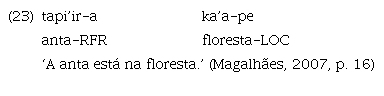 É por isso que se interpreta que, nesse tipo de língua, os predicados que têm como núcleo nomes em sentenças em que há um predicado verbal expressando um evento são sintagmas que exercem a função de predicados subordinados e coindexados à marca de pessoa do predicado verbal principal. No caso das línguas TG, o sufixo referenciante (RFR) -a ~ -Ø marcaria os nomes cuja função primária como núcleo de predicado é substituída pela função de adjunto correferencial: ao receber o sufixo, eles tornam-se capazes de referir, como defende Queixalós (2006).