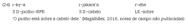 As expressões adverbiais monovalentes são aquelas que, em função de predicado, admitem apenas um argumento externo. Estas são formadas por advérbios – (22) – e por nomes associados ao sufixo locativo -pe – (23). Já as expressões adverbiais divalentes são formadas por posposições que, em função de predicado, expressam sempre, além do seu argumento externo, um argumento interno, como ilustrado em (24), em que a posposição -ehe ‘sobre’ contém um argumento interno, ijakara’a ‘cabelo dele’, e um argumento externo, ikya ‘piolho dele’6.