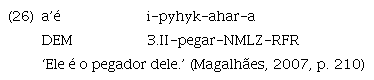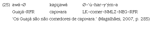 Podemos dizer que, quando as nominalizações formam nomes divalentes, sempre terão um complemento nominal como seu argumento interno, expresso ou por um sintagma nominal (SN), como em (25), ou pela série II de marcadores pessoais, como em (26). Além disso, a negação de núcleos lexicais nominalizados, como em (25), ocorre com o sufixo -’ým ~ -ỹ, o mesmo que se afixa a nomes, a exemplo de (27), expressando negação privativa:
