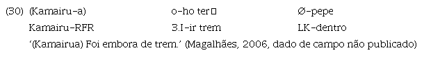 Nesse contexto, o exemplo (30) teria três predicados, um nominal, um verbal e um adverbial, sendo naturalmente um superior ao outro, uma vez que deve haver uma hierarquia entre eles. Nesta sentença, o predicado principal, ou dominante, é o predicado verbal o-ho <3.I-ir> ‘(ele) foi embora’, acompanhado por dois predicados secundários, opcionais, adjuntos e hierarquicamente inferiores: um predicado cujo núcleo nominal Kamairu, associado ao sufixo referenciante -a, é um adjunto correferencial ao argumento o- (3.I), expresso no núcleo do predicado verbal; e um predicado cujo núcleo é uma expressão adverbial terẽ ø-pepe <trem LK-dentro> ‘de trem’15: