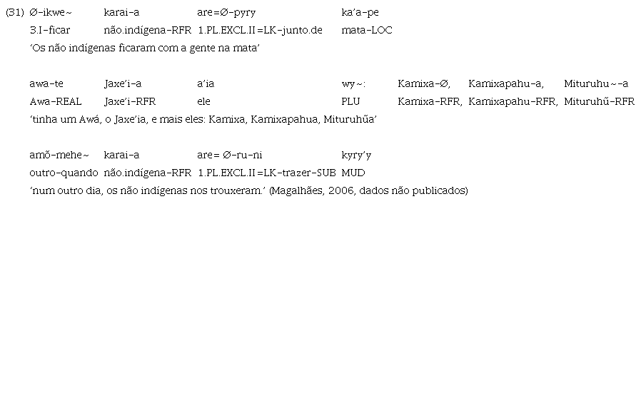 Além disso, não apenas verbos eventivos divalentes e monovalentes, mas também os monovalentes estativos e predicados nominais podem ser encontrados nesse tipo de construção, o que difere o Guajá das demais línguas da família até agora descritas.