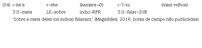 Da mesma forma que no Apyãwa e no Kamaiurá, no Guajá o SN que antecede o predicado verbal subordinado nunca ocorre dentro do sintagma, isto é, o verbo obrigatoriamente expressa seu argumento por meio da série II16, mesmo que o SN referente a ele esteja contíguo à forma verbal, conforme os exemplos (34) e (33).
