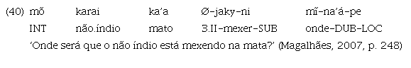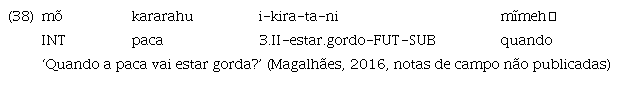 Vale a pena aqui salientar que outras línguas da família, como o Parintintim e o Apyãwa, também apresentam essa mesma construção associada a partículas interrogativas na posição inicial da sentença. O Parintintim, por exemplo, ativa a estrutura aqui em análise quando o verbo é antecedido pela partícula interrogativa marã ‘como’: