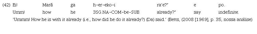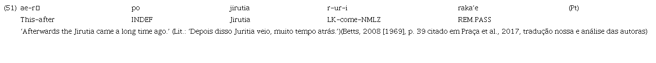 Em sua análise do Parintintim, Betts (2008 [1969]) explica o fenômeno da alteração da forma verbal nessas construções – exemplos (50) e (51) –, a que denomina ‘forma demonstrativa do verbo’ como sendo aquela relacionada ao que o narrador considera como tópico, em contraste com a forma verbal sem sufixo, a que denomina ‘forma declarativa do verbo’, que seria usada quando o narrador considera a informação como o desenvolvimento de um tópico20.