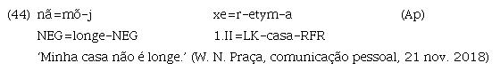 O tipo de negação utilizado no Apyãwa associado ao dêitico mõ, ilustrado no exemplo (44), evidencia que esta palavra, que pode ser interpretada como um advérbio locativo na língua, funciona como predicado, uma vez que a negação nã=...-j é específica de predicados no Apyãwa: