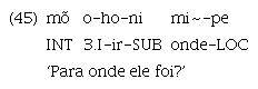 Por outro lado, a existência de um advérbio mõ na língua Apyãwa (Ap) – exemplo (43) – poderia ilustrar a origem adverbial da partícula interrogativa do Guajá, justificando a ativação também dessa construção nos casos em que a partícula interrogativa introduz a sentença. Assim, uma possibilidade que precisa ser melhor investigada é a de que ela teria se gramaticalizado a partir de um advérbio e, nesse processo, o sufixo -ni teria se cristalizado como parte de um dos itens lexicais da sentença, já tendo perdido sua função original.