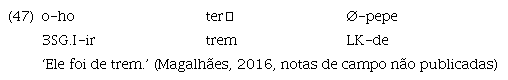Em (1), repetido como (47), a expressão adverbial terẽ ø-pepe ‘de trem’ está subordinada ao predicado verbal que tem como núcleo o verbo ho ‘ir’, e que é o predicado naturalmente dominante e expressa seu argumento por meio de uma marca de pessoa da série I: