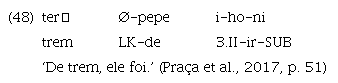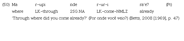 Em (2), repetido como (48), a expressão adverbial terẽ ø-pepe ‘de trem’ torna-se o predicado dominante, e o predicado verbal, que tem como núcleo o verbo ho ‘ir’, fica subordinado ao primeiro, tornando-se, assim, menos finito, o que é evidenciado pelo fato de que ele passa a expressar seu argumento por meio de um prefixo da série II e a receber um sufixo, como observado nas demais orações subordinadas da língua. Portanto, entendemos que o sufixo -ni ~ -ri deve ser interpretado como um sufixo subordinador em termos sintáticos18: