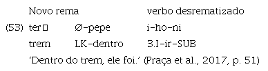 Em termos pragmáticos, Praça (2007, p. 122) descreve o fenômeno, denominado por ela de Indicativo II, no Apyãwa (ou Tapirapé), como a ‘rematização’ das expressões adverbiais. Ela explica que tais expressões ocupam, no Apyãwa, usualmente a posição final da sentença, não apresentando informação essencial para o predicado em que ocorrem. No entanto, ao serem removidas para a posição esquerda da sentença, tornam-se o rema, isto é, a informação mais importante, contextualizando o evento descrito pelo verbo.
