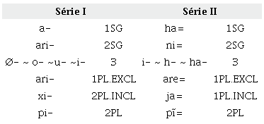 Para melhor entender as classes de palavras predicativas e sua valência, é importante apresentar as duas séries de marcadores pessoais que ocorrem na língua.