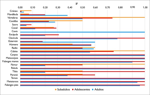 El análisis de IF por categoría de edad (Figura 2) indica que, en los subadultos, el fémur, el cúbito y las vértebras no presentan fragmentación (IF = 1), mientras que los más fragmentados son la mandíbula (IF = 0,07) y el cráneo (IF = 0,09). En adolescentes, las clavículas, las rótulas, las tibias y los huesos de las manos y los pies se encuentran sin fragmentar (IF = 1); por otro lado, el cráneo (IF = 0,01) y el sacro (IF = 0,09) son los elementos óseos más fragmentados. En los adultos, los elementos menos fragmentados son el coxis, la rótula y los huesos de las manos y los pies (IF ≥ 0,90). Al igual que en los adolescentes, los elementos más fragmentados son el cráneo (IF = 0,03) y el sacro (IF = 0,05). En base al promedio de los IF, el conjunto de elementos óseos de subadultos está altamente fragmentado (IF = 0,23), mientras que los huesos de adolescentes (IF = 0,48) y de adultos (IF = 0,54) presentan fragmentación moderada. Sin embargo, la prueba de Kruskall-Wallis indica que no hay una diferencia significativa entre los IF y las distintas categorías de edad (H = 0,37; p > 0,05).