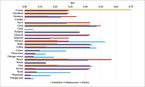En cuanto al análisis del Índice de Representación Ósea según las tres categorías etarias consideradas (subadultos, adolescentes y adultos; Figura 3), se observa que las costillas son los elementos menos representados (con IRO menores al 0,005) en los tres grupos de edad. Específicamente, entre los subadultos el elemento óseo más representado es el cráneo (IRO = 0,71) y el de menor representación, además de las costillas, es el peroné (IRO = 0,07). Entre los adolescentes, el fémur (IRO = 0,57) es el elemento más representado y, en general, todos los huesos largos (con excepción del húmero) presentan una alta representación. Por otro lado, los huesos de las manos (IRO ≤ 0,10), de los pies (IRO < 0,10) y la rótula (IRO = 0,14) están poco representados. Por último, en los adultos, los valores más altos se encuentran en los huesos largos, siendo el húmero el elemento más representado (IRO = 0,53). Los huesos menos representados, además de las costillas, son el coxis (IRO = 0,06) y las falanges de los pies (IRO = 0,06).