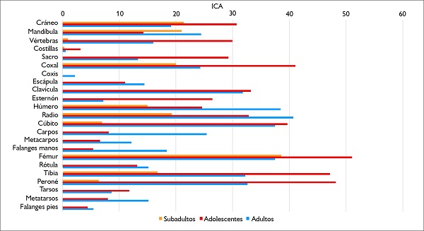 Con respecto al Índice de Completitud Anatómica y su relación con la categoría etaria (Figura 4), los resultados permitieron identificar que los elementos óseos más completos son el fémur para los subadultos (ICA = 39) y adolescentes (ICA = 51) y el radio para los adultos (ICA = 41). Los huesos menos completos son las costillas para las tres categorías etarias (ICA = 0,29 en subadultos, 3,2 en adolescentes y 0,59 en adultos), seguidas por las vértebras para los subadultos (ICA = 1), las falanges del pie para los adolescentes (ICA = 4) y el coxis para los adultos (ICA = 2).