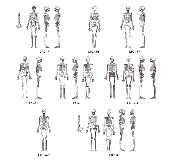 Al cruzar la información entre la presencia de pigmento y de huellas de corte, se observan ambos rasgos en 11 elementos óseos correspondientes a dos de estos entierros (LTC1-S2 y LTC1-S4). Asimismo, en cuatro de estos elementos fue posible cotejar que el colorante se encuentra en el interior del surco de la huella, lo cual refleja que la aplicación del pigmento fue posterior al descarne o desarticulación de los huesos. En conjunto, la información sobre los paquetes funerarios en relación con las huellas de corte, la presencia de partes articuladas en algunos de ellos y la aplicación de pigmento evidencian que las acciones realizadas para la conformación de cada uno de estos entierros fueron variables, así como las trayectorias seguidas por cada uno de los individuos que los conforman.