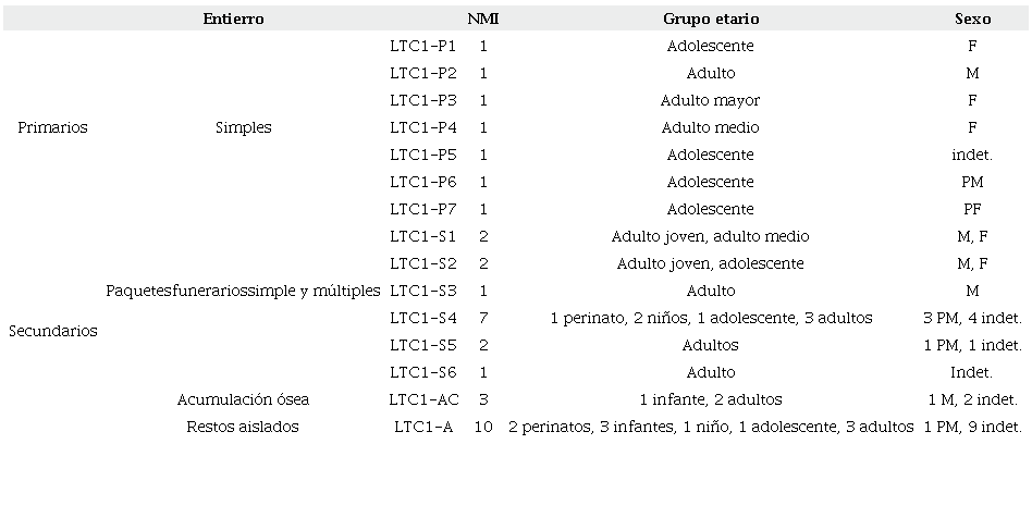 En cuanto a los seis paquetes funerarios hallados en el sitio -entre los cuales se encuentran representados 15 individuos-, dos son simples (LTC1-S3 y LTC1-S6), tres son dobles (LTC1-S1, LTC1-S2 y LTC1-S5) y uno es múltiple (LTC1-S4; NMI=7; Tabla 1). Estos entierros secundarios muestran una gran variabilidad en su composición en cuanto a la cantidad de elementos, los huesos presentes, al número de individuos representados y a la composición sexo-etaria (Tabla 1; Scabuzzo & Ramos van Raap, 2017). La acumulación ósea -un conjunto de huesos sin relación anatómica y asociados espacialmente pero sin un orden aparente como los paquetes funerarios-, está conformada por los restos óseos de al menos tres individuos. Finalmente, entre los 242 huesos hallados de forma aislada en el núcleo inhumatorio del sitio se determinó un número mínimo de 10 individuos de distintos grupos etarios (Tabla 1). En el trabajo de Scabuzzo y Ramos van Raap (2017): Figura 3, se presenta una planta con la distribución espacial de todos los entierros; y en la publicación de Bonomo et al. (2019): Figuras 4A, 4B y 4C, se exponen representaciones de algunos de los entierros primarios y de un paquete funerario doble hallado en el sitio.