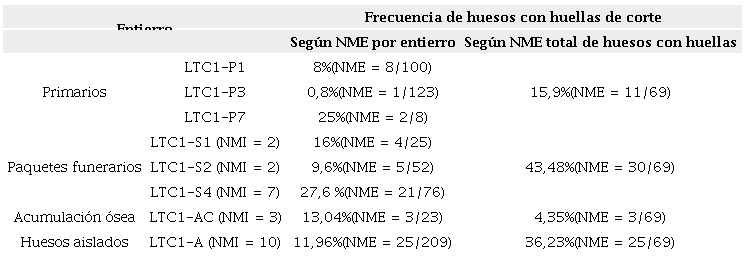 El relevamiento de huellas de corte efectuado en la muestra bioarqueológica evidenció una recurrente manipulación de los cuerpos luego de la muerte. Estas trazas antrópicas fueron registradas en individuos de ambos sexos y de todas las edades y también en los distintos tipos de entierros, con una prevalencia claramente mayor en los paquetes funerarios y huesos aislados, y con menor frecuencia en los entierros primarios y en la acumulación ósea. En cuanto a los paquetes funerarios, se relevaron huellas de corte en elementos óseos presentes en tres de estas seis inhumaciones. Las frecuencias registradas en ellas varían entre el 9,6% (LTC1-S2) y el 27,6% (LTC1-S4); cabe recordar que este último entierro es en el que más individuos están representados (NMI = 7). Las actividades inferidas para estas huellas son de descarne y desarticulación, lo cual indica la ejecución intencional de tales acciones previo a la incorporación de los elementos óseos en los paquetes funerarios. También es importante destacar que dos de los tres paquetes secundarios con huellas antrópicas (LTC1-S2 y LTC1-S4) presentaban partes anatómicas articuladas (respectivamente: vértebras-costillas; radio-cúbito-carpos-metacarpos-falanges y fémur-tibia). Esto evidenciaría la inclusión simultánea de partes esqueletizadas y otras con tejido blando en estos entierros. Aun así, en algunos de estos huesos articulados (correspondientes a dos individuos del paquete LTC1-S4) se registraron huellas de corte. Estas trazas permiten inferir que también se efectuó cierta manipulación de las porciones anatómicas articuladas antes de su inclusión en este paquete funerario en particular. Por otra parte, es interesante mencionar que en los entierros secundarios LTC1-S3 y LTC1-S6 no se observaron ni huellas de corte ni partes anatómicas articuladas. Esta particularidad podría ser indicio de que los restos ingresaron esqueletizados y que, probablemente, tal esqueletización se produjo por medios naturales (por ej. a partir del entierro previo del esqueleto o la exposición del individuo a la intemperie).
