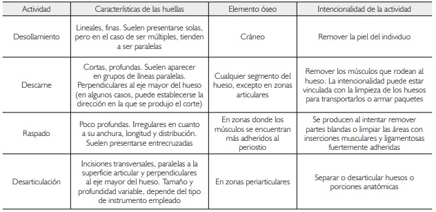 Finalmente se procedió a la interpretación de los datos obtenidos. Para ello, se buscó vincular las huellas con algún tipo de actividad relacionada con la manipulación intencional en un contexto mortuorio. En este sentido, las actividades inferidas fueron desollamiento, descarne, raspado y desarticulación, según las propuestas de Botella López (2005) y Solari (2010). En la Tabla 2 se detalla para cada una de estas actividades inferidas cuáles son las características de las huellas, el elemento óseo donde son más frecuentes y la intencionalidad de la actividad realizada.