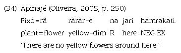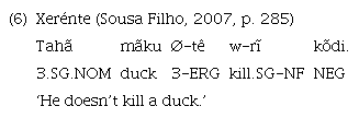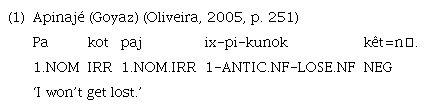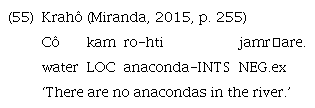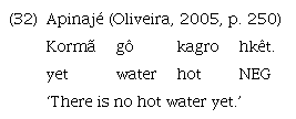 As we can see in Apinajé (29), Oliveira (2005, p. 251) takes the lexical verb that combines with the (h)kêt negator to be non-finite. So do Beauchamp et al. (2017) and Gildea and Castro Alves (2010, p. 187) and they all furthermore take (h)kêt to come from a negative existential (Oliveira, 2005, p. 390; Gildea & Castro Alves, 2010; Beauchamp et al., 2017). Miranda (2015, p. 215), however, tentatively proposes ‘not do’ as the original meaning. We will come back to the latter idea later. (32) and (33) illustrate existential uses.