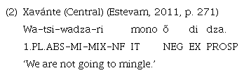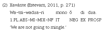To conclude about Xavánte, even an example of a seemingly standard negation use of a privative negator as in (23) has not changed our opinion on the origin of the present-day Xavánte standard negator õ. It is unlikely to have arisen from an earlier privative use in the context of the promotion of a secondary predication to the status of a primary predication.