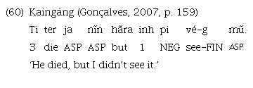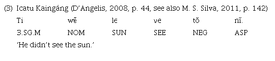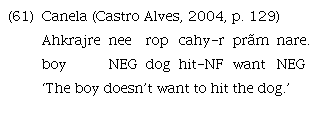 Second, for some languages the negator may not only be postverbal but clause-final. Of course, Jê languages have their verbs in the right periphery of the clause, a negator that is strictly speaking only postverbal and not clause-final will often end up in clause-final position anyway. But for at least four languages there are explicit claims that the negator has to go at the end of the clause. It has been said for Krahô nare by Miranda (2015, pp. 250-251) and for Apinajé by Oliveira (2005, p. 248) and we have no reason to doubt these claims. It has also been claimed for Kaingáng. The claim comes from M. S. Silva (2011, p. 203), it concerns the negator tũ (tõ in (3)) and it is certainly true that most of the examples have it in clause-final position. But M. S. Silva (2011, p. 121) also claims that the clause-final slot is typical for aspect particles, and in the one example that has both a negator and an aspect particle, it is the aspect particle that comes last.
