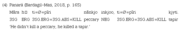 As said earlier, we focus on standard negation. However, we bring in existential, privative and prohibitive negation to the extent that these uses can shed light on the origin of the standard negator. For the same purpose we occasionally bring in negators of the wider Macro-Jê family. It is obvious that a comprehensive account requires a look at all negative forms, in the manner of Miranda (2015), and in the whole Macro-Jê family. Similarly, we do not discuss the properties of the non-finite verbs that typically occur in standard negation, and we don’t say much about the alignment patterns of either the ancestral or the present-day negative constructions (see esp. Castro Alves, 2010; Beauchamp et al., 2017; Gildea & Castro Alves, 2010, 2020).