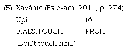 Estevam (2011, pp. 270-271, 277) treats õ as one of two allomorphs, with õ for the ‘indicative’ – the standard negator – as in (2), and tõ for the ‘subjunctive’, used as the prohibitive in (5).