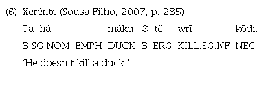 We will see in the section on Timbira *inõare that Canela has gone through the process of ‘privativization’ of the existential negator, too, but with a different negator. Canela, like the *kêt languages, is a Goyaz language. Could this process be unique to Goyaz? Gildea and Castro Alves (2020, p. 90) remark that what we call ‘clefting’ is indeed found throughout Goyaz, but that does not mean that it cannot occur elsewhere. In fact, we have already suggested that we may see clefting in Xerénte (9), where it could be argued to have the stativizer di. It is also useful to review the Xernte example (6), repeated below.