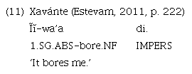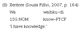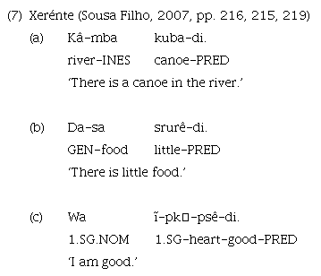Notwithstanding the similarity between Xavánte (2) and Xerénte (6), grammarians do not agree about the status of di. Let us start with Sousa Filho (2007) analysis. Sousa Filho (2007) distinguishes three non-negative uses of di. In one use it is called a ‘predicative morpheme’ and it is usually glossed as pred (Sousa Filho, 2007).