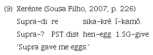 Sousa Filho (2007, p. 226) does not analyze this use, hence the question mark in the glosses. One wonders whether it could be a kind of topic (or focus) structure – at least, originally – with ‘Supra’ as topic (or focus), suggesting something like ‘It is Supra that gave me eggs’, in which English too uses a stative copula.